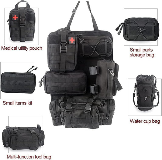 LED Auto Seat Back Organizer Bag,Car Back Seat Organizer Kick Mat with 5 Storage Packets-3 Toolkits &1 Medical Kit&1 Water Cup Bag Compatible with All Vehicel