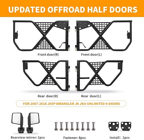 - 【Fitment】Tube Doors Half Door Safari Tubular for 2007-2018 Jeep Wrangler JK JKU Unlimited 4-Doors Sport | Sahara | Rubicon.these tube doors are the perfect addition to your Wrangler, delivering uncompromising durability and special style.