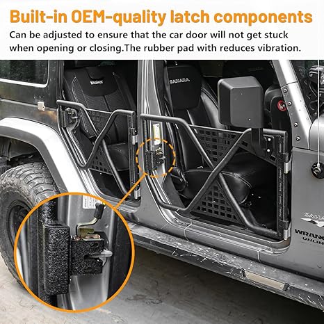 - 【Durable Material】The sturdy and heavy steel pipe structure ensures safety performance. Featuring a textured black powder-coated surface and premium internal electronic coating, Durable and corrosion-resistant. The built-in OEM-quality latch components can be adjusted to ensure that the car door will not get stuck when opening or closing.The rubber pad with reduces vibration.