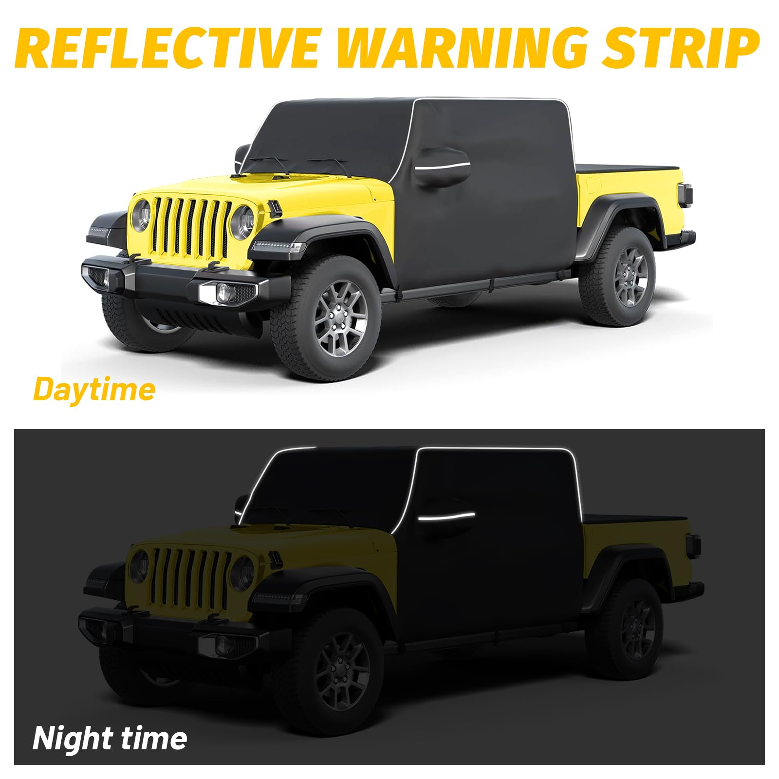 - 【More Details】This Gladiator cover has 2 Reflective Stripes serve as a nighttime reminder to others, ensuring parking safety. The cab cover comes with a mirror pocket to perfectly protect your side mirrors and prevent damage.