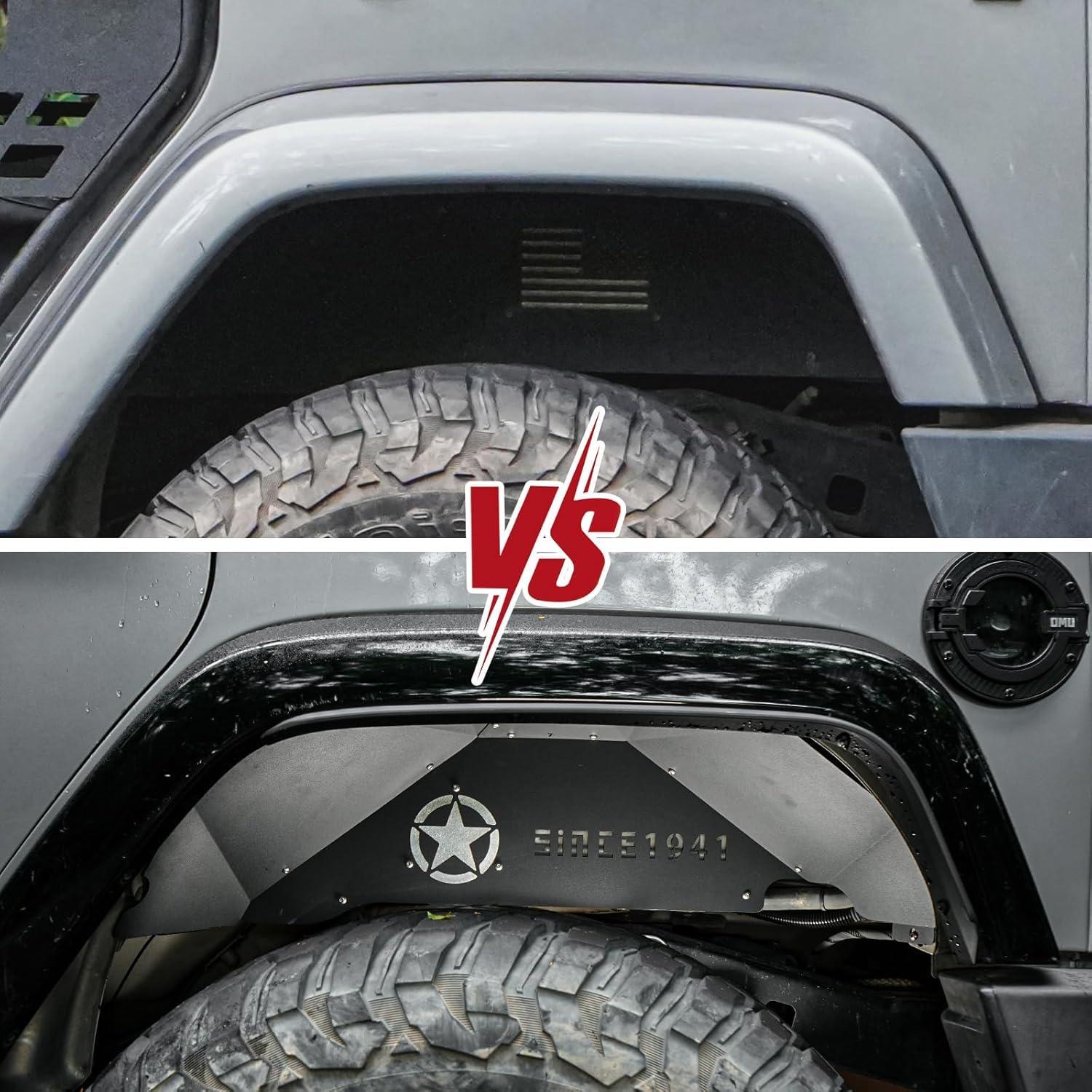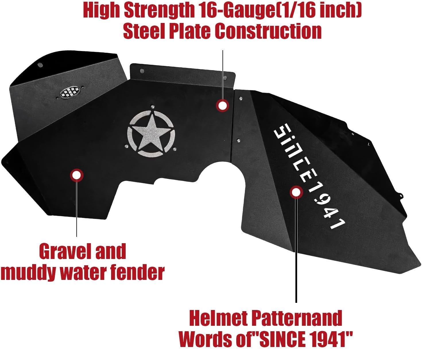 - 【Fitment】Inner fender guards are compatible with 2007-2018 Wrangler JK & JKU (4-Door/2-Door). Please ensure that Front and Rear Inner Fender Liners are suitable for your vehicle before making a purchase.