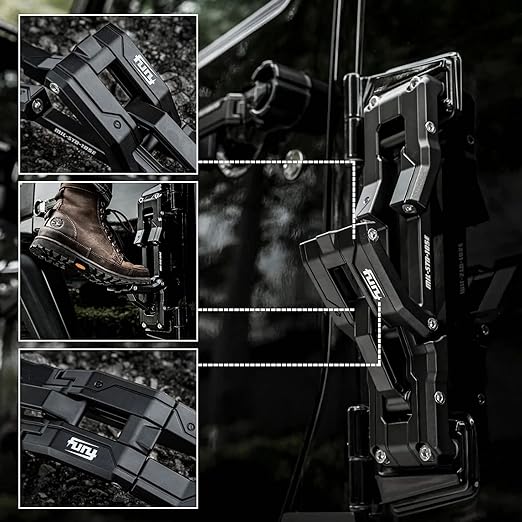 - INSTALACIÓN SIMPLE: no se requiere taladrar, cortar ni soldar. En cuestión de minutos, tu jeep podrá volver a la pista con un nuevo y práctico pedal que te ayudará a montar fácilmente la carga en el techo del jeep.