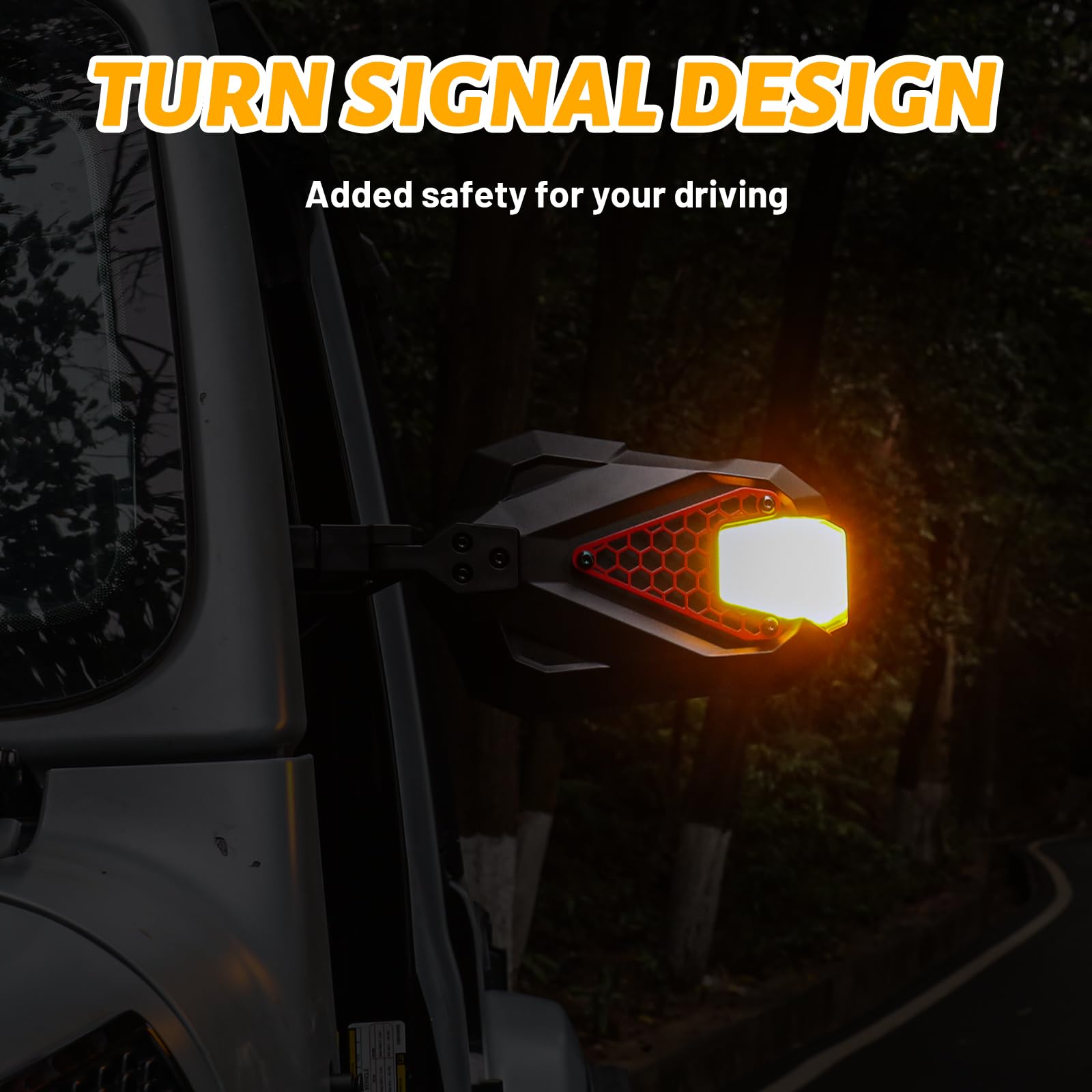 - 【Weatherproof LED Signaling】IP65-rated Wrangler side mirrors with integrated LED turn signals feature waterproof connectors for reliable operation. Maintain visibility in rain/snow while meeting road safety regulations. Brighter than stock lights with anti-flicker technology.