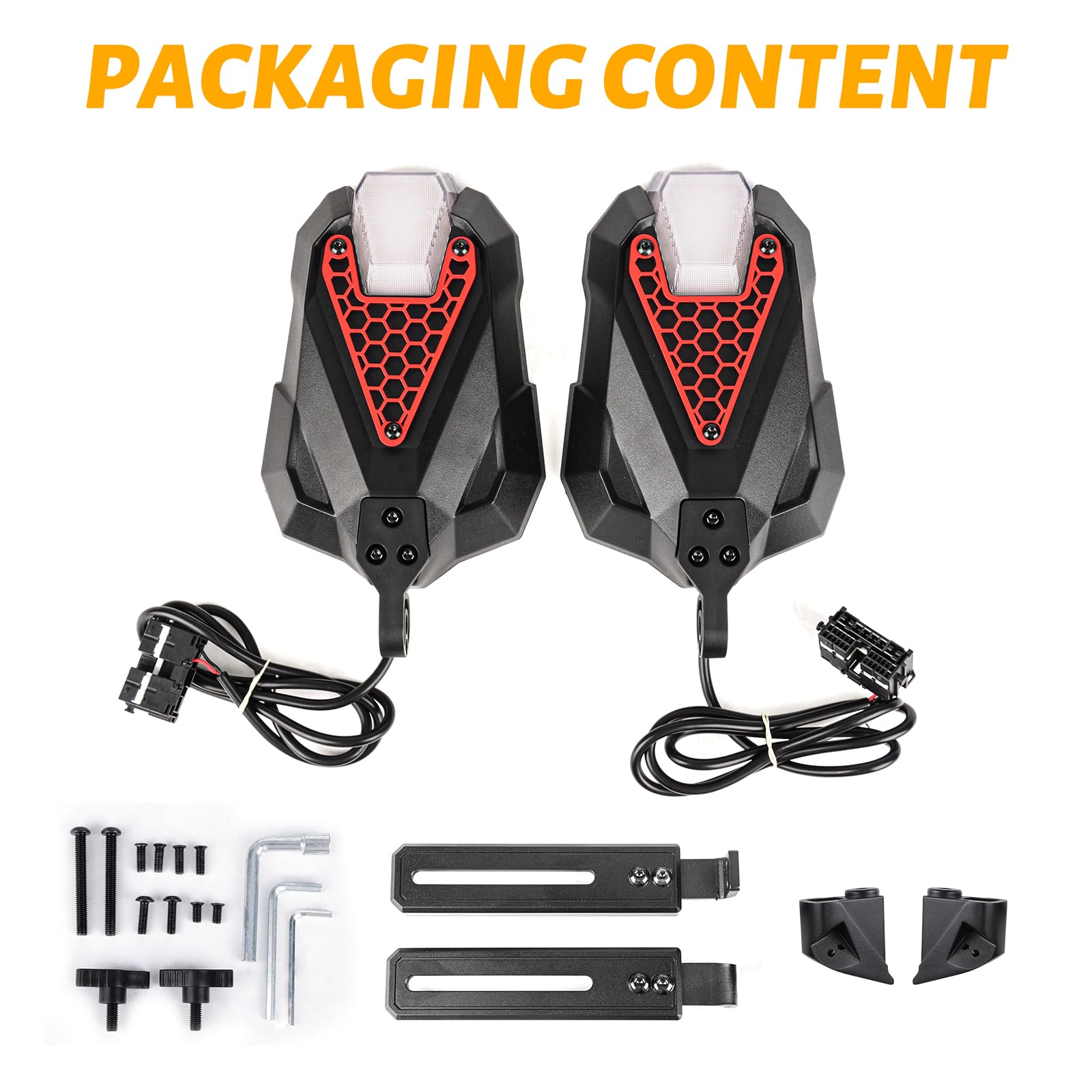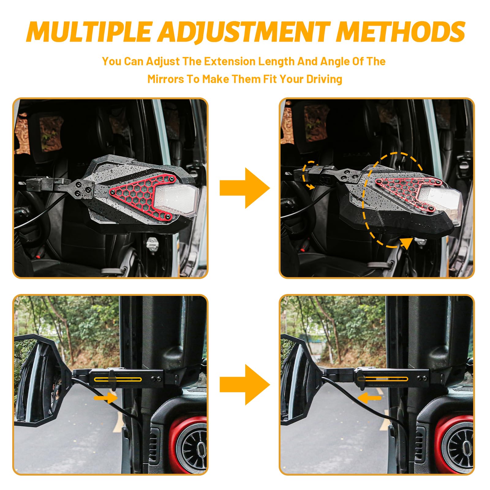 - 【Drill-Free Installation】Enjoy tool-free setup in minutes—attach mirrors & connect plug-and-play electrical connectors for instant use. Seamless transition for Wrangler mirrors doors off JL/JT. If there is any problem in the product, please message us, we will reply you within 24 hours.