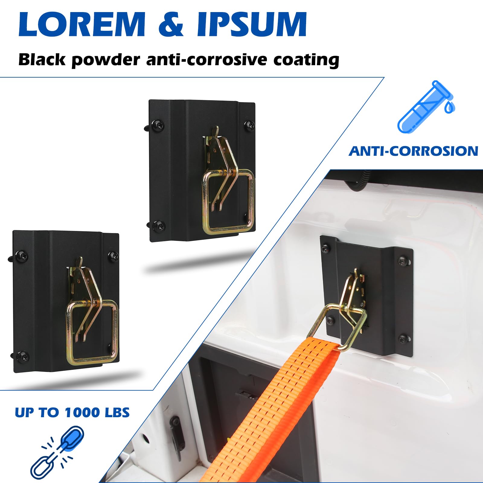 • 【Easy installation】The bed tie down anchors are made to be installed in seconds and require the use of no special tools, drilling, or any hassles. Just put it to the right positions of your truck bed, use a screws twist to tighten the 4 holes.