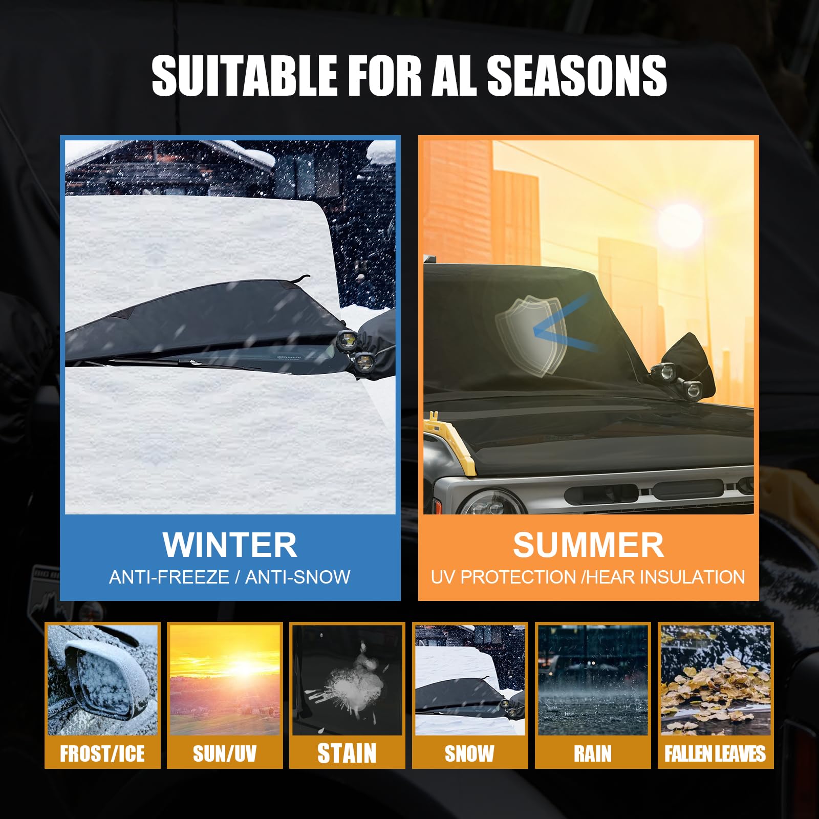 - 【Years of Non-Fading Cover】UV test can reproduce the damage caused by sunlight, rain and dew through equipment. Tests show that the anti-frost windshield ice cover can withstand at least 3 years of UV aging, which is much better than other products. Due to its anti-fading function, our car windshield cover can keep your windows clean and bright for many years!