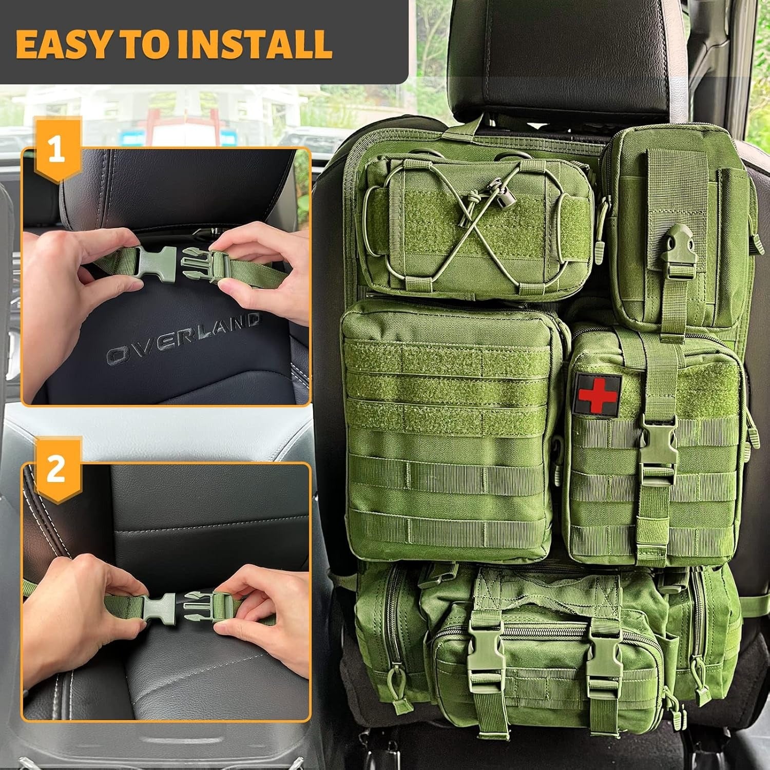 - 【Easy To Use】With adjustable strap, easily adjust to fit around your headrest and at the bottom between the seat back and base. Each Molle bags has been designed with velcro tape and buckle, each pouch is flexible to be added or remove.