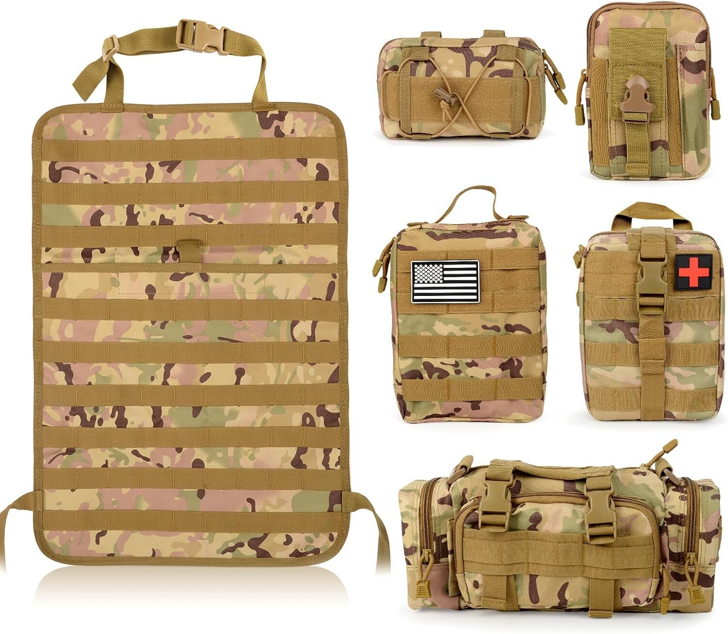 - 【Easy To Use】With adjustable strap, easily adjust to fit around your headrest and at the bottom between the seat back and base. Each Molle bags has been designed with velcro tape and buckle, each pouch is flexible to be added or remove.