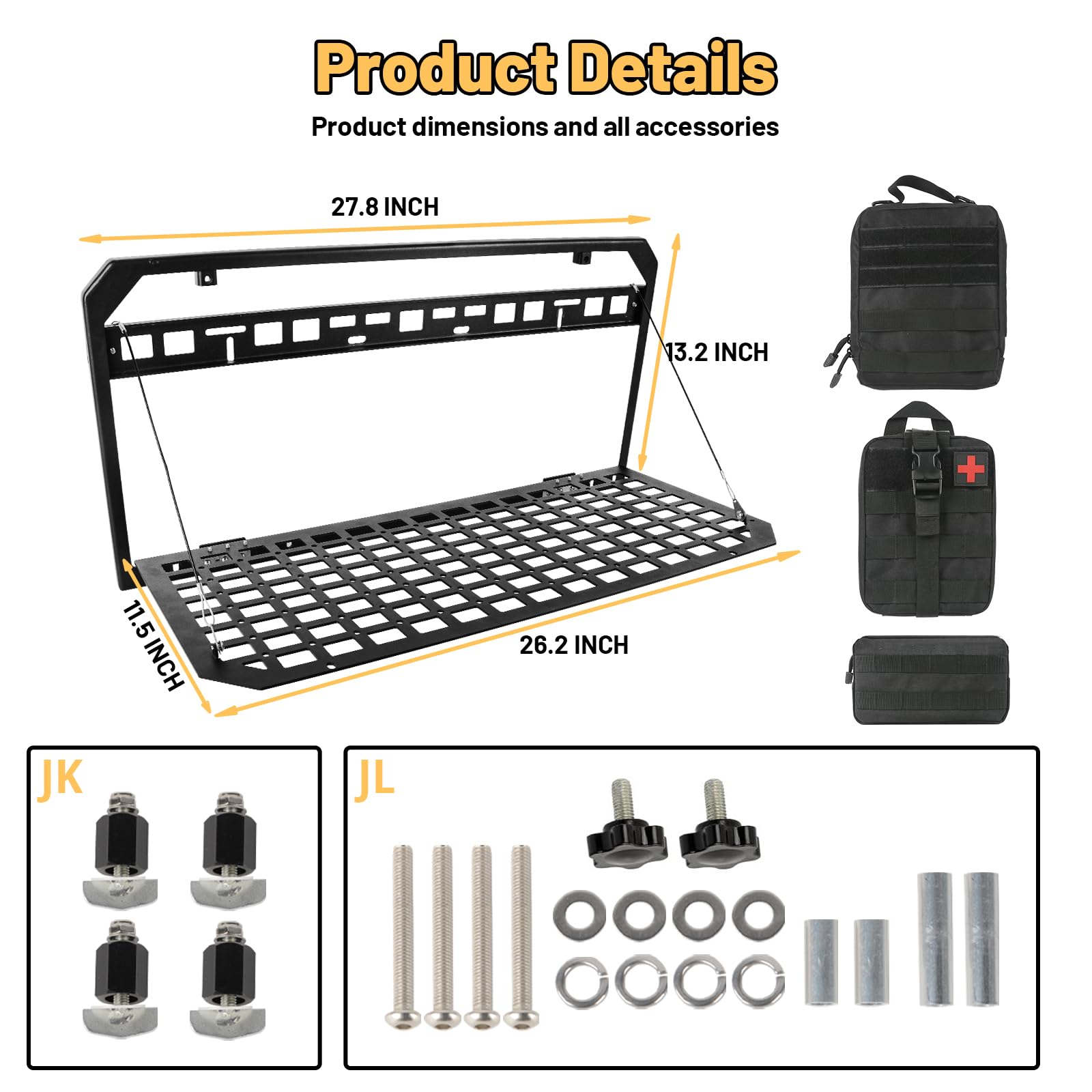 • Perfect Fitment--Tailgate Table with 3 Molle Pouch suitable for Jeep Wrangler JKU & JL JLU 2007-2024 4 Door.It is an essential thing for outdoor travel and camping activities.(Not fit with Low Speaker JK models,such as 2 door Jeep JK Rubicon,Jeep Wrangler Sahara Unlimited)