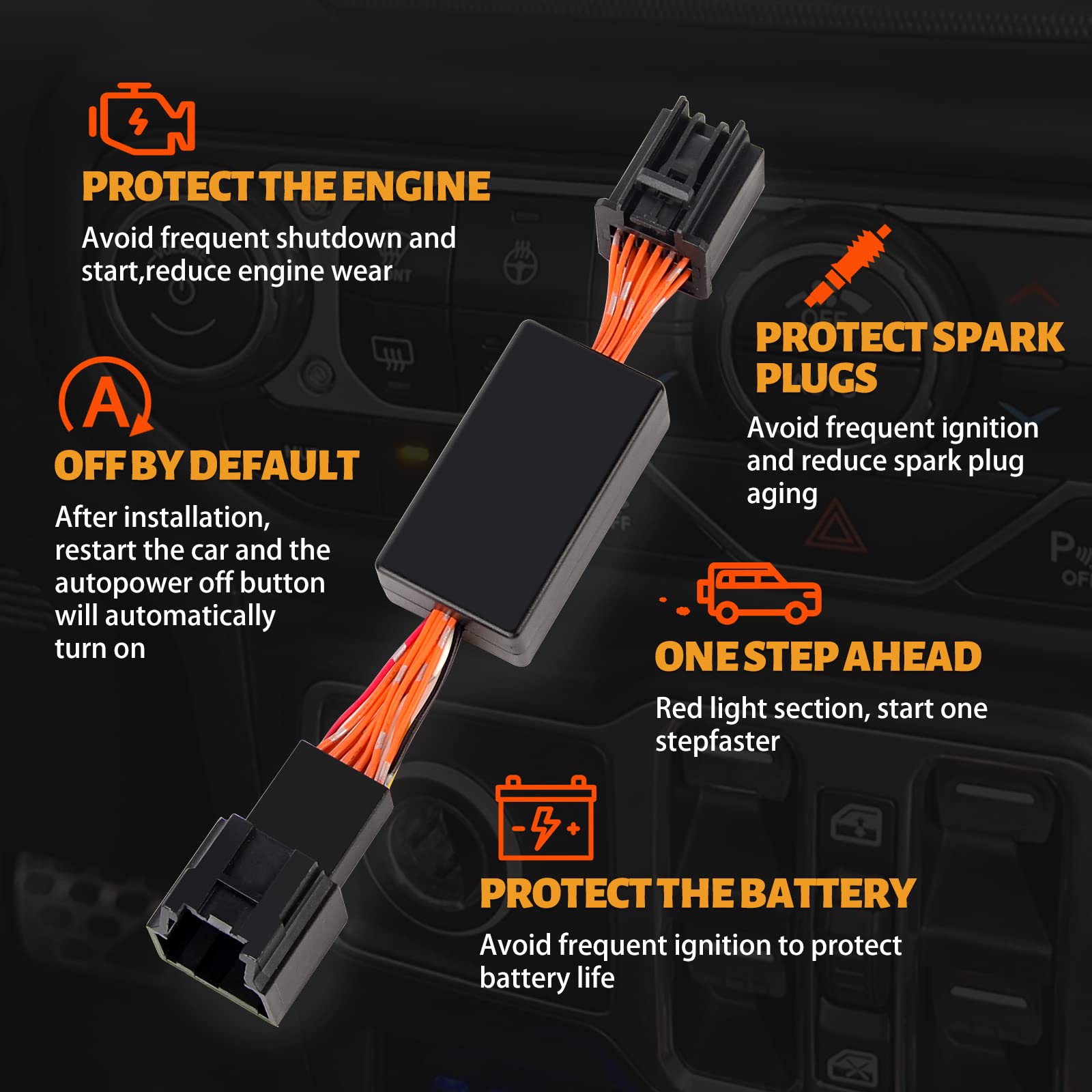 - Function: Close the auto stop start engine system. After install this module, A-OFF function will be closed automatically when you turn on your Jeep Wrangler. If you want it for a moment, press the off button to reactivate the function.