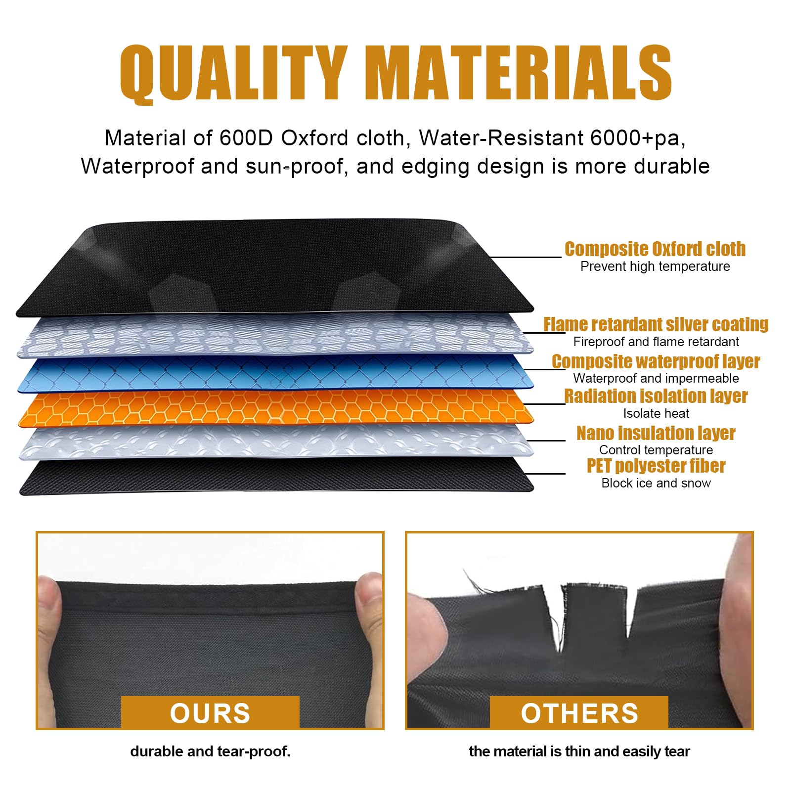 - 【Upgrade Six-Layer Protection】Crafted from durable 600D Oxford fabric material, this cover resists water pressure up to 6000+pa and offers excellent wear and tear resistance, effectively shielding your vehicle from rain, snow, UV rays, dirt, and grime.