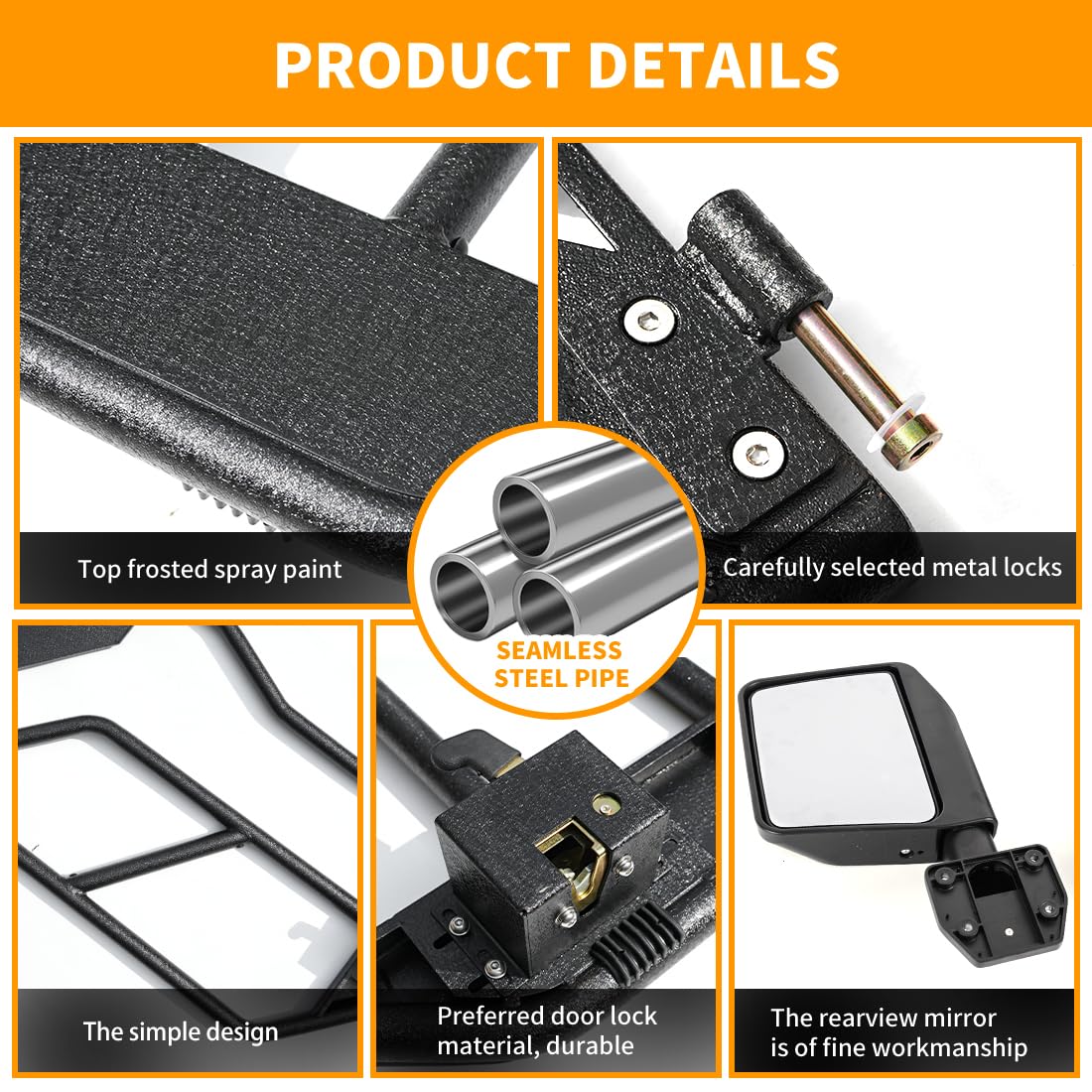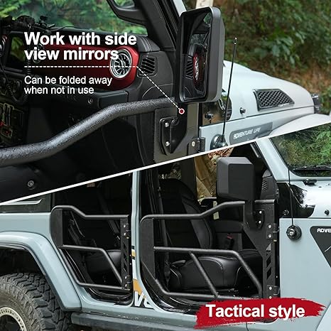 - 【A Set of 4 with Mirrors & Hardware】Includes 4 tubular doors, 2 side mirrors, and all necessary mounting hardware. The manually adjustable mirrors ensure a clear rear view for safer driving.Worry free purchase! Any manufacturing de fects and damage during delivery will be backed by our customer service.