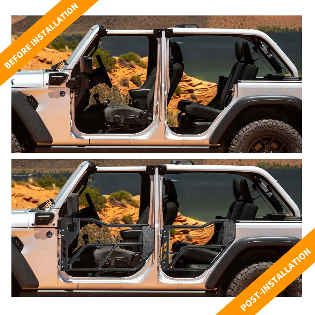 - 【Vehicle Compatibility】Designed for 2018-2024 Jeep Wrangler JL, JLU, and 2020-2024 Gladiator JT 4-Door models, including 4XE. These steel tube half doors offer an open-air off-road experience.