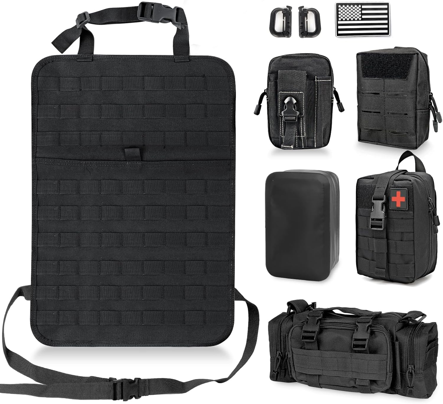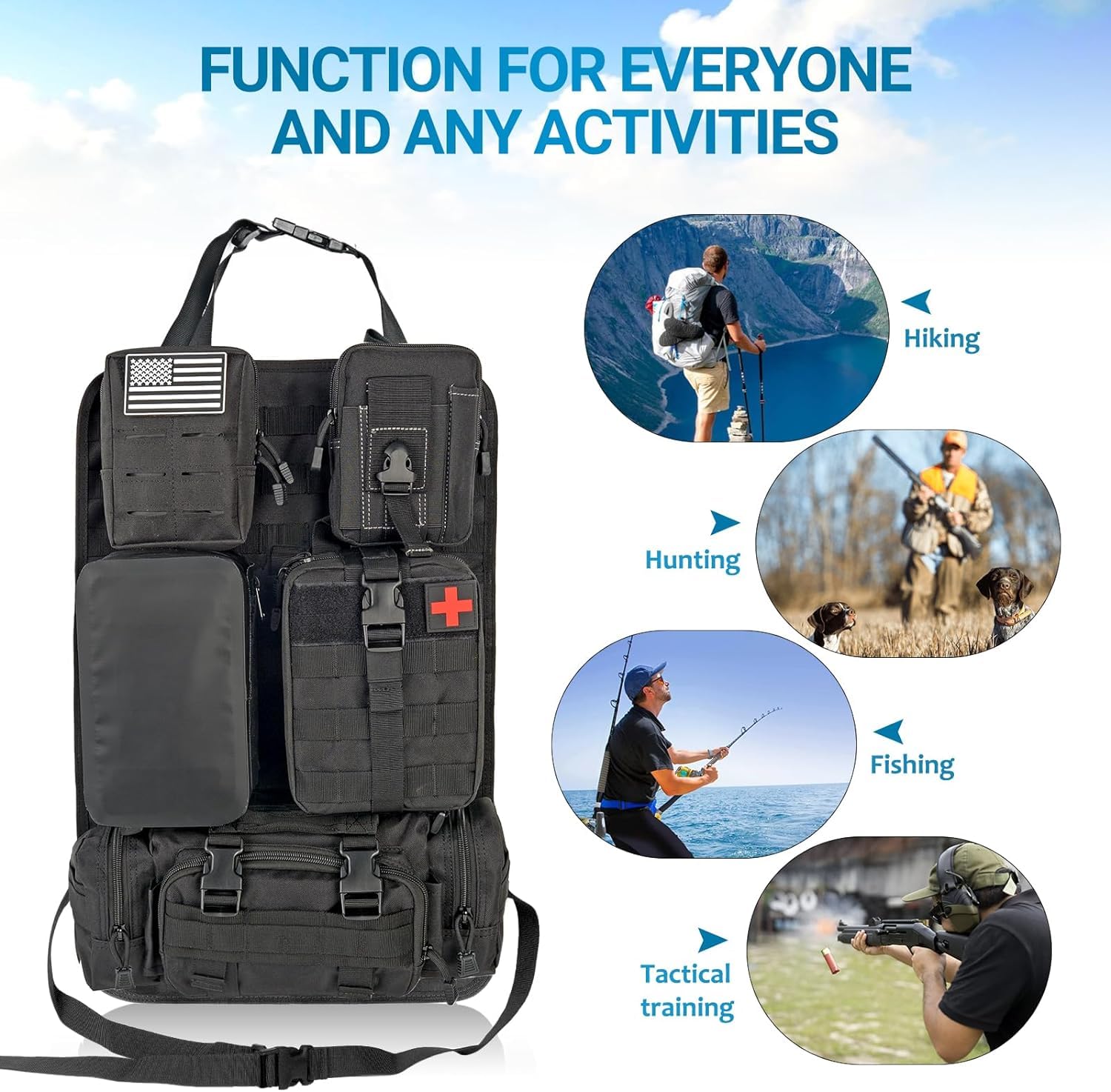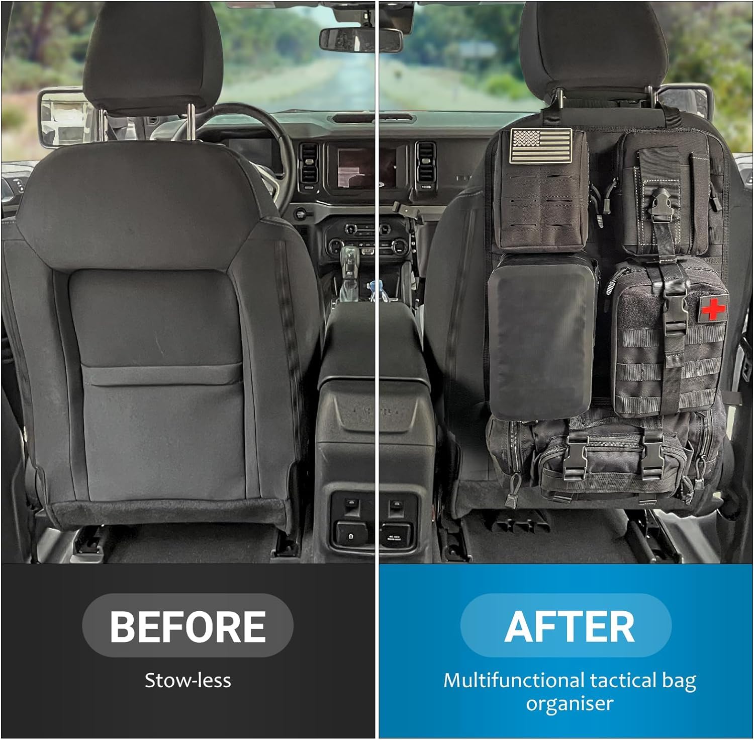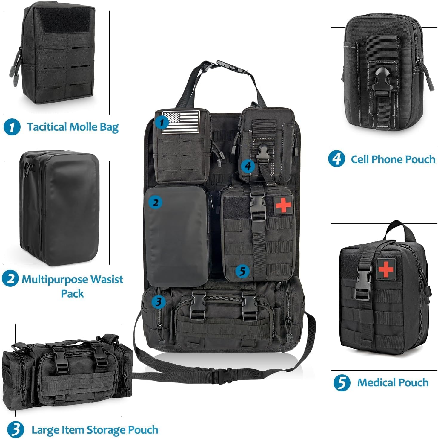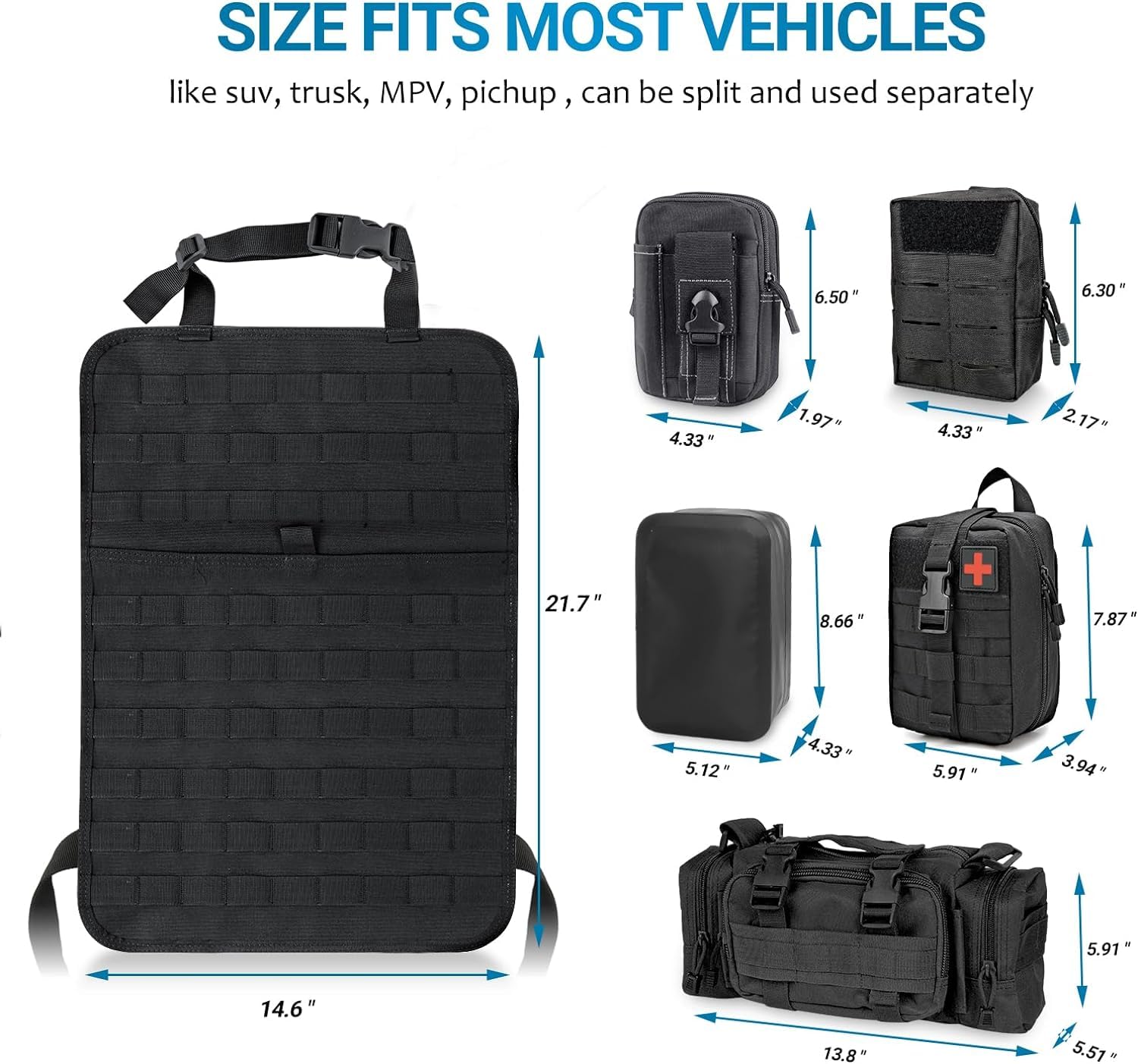 - MULTIFUNCTIONAL STORAGE SYSTEM - The MOLLE strap design of the Molle Seat Back Organizer allows you to hang bags, kits, rules and scissors to expand your storage space. You can also detach the pouch from the molle panel and take it with you when getting in and out of the car.