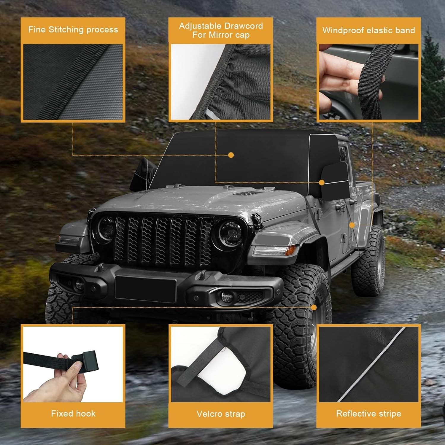 Guina Windshield & Front Side Window Cover Compatible wirh Jeep Wrangle JL JT 18-24, 600D Oxford Cloth Windshield Cover with Mirror Cover for Sun, Rain, Sand, Dust, Leaves, Branches Protection
