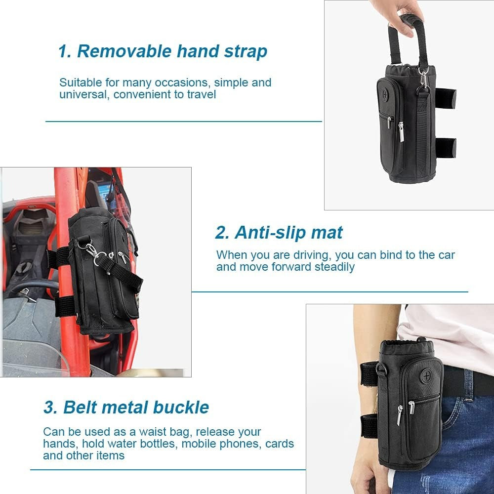 - The water cup bag can be used on UTV, bicycles and strollers. The fixing belt is made of pu leather, which has a good anti-slip effect. Comes with a plastic hand strap, so it won’t hurt your hands when you carry it directly. When you are tired, you can also buckle it directly on your belt.