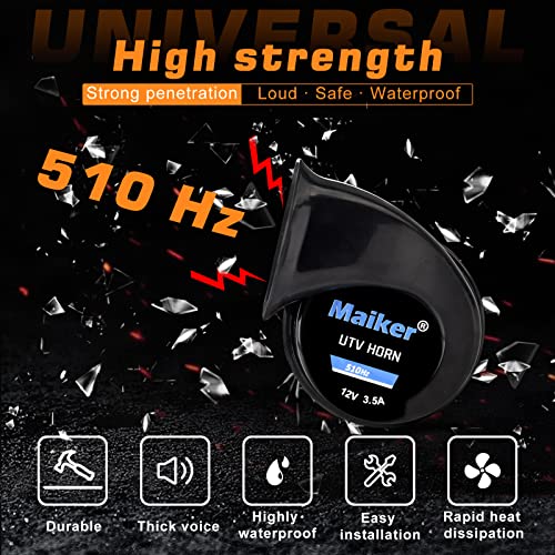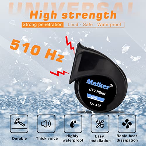 - Loud Horn---12V, 510HZ. Enough noise to alert other pedestrians and vehicles without alarming them suddenly. Loud UTV Horn sounds like an automotive horn, very loud, support short press and long press. Widely fit in sport, multipurpose and utility.