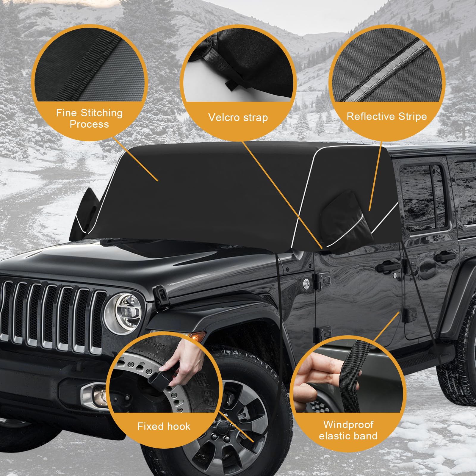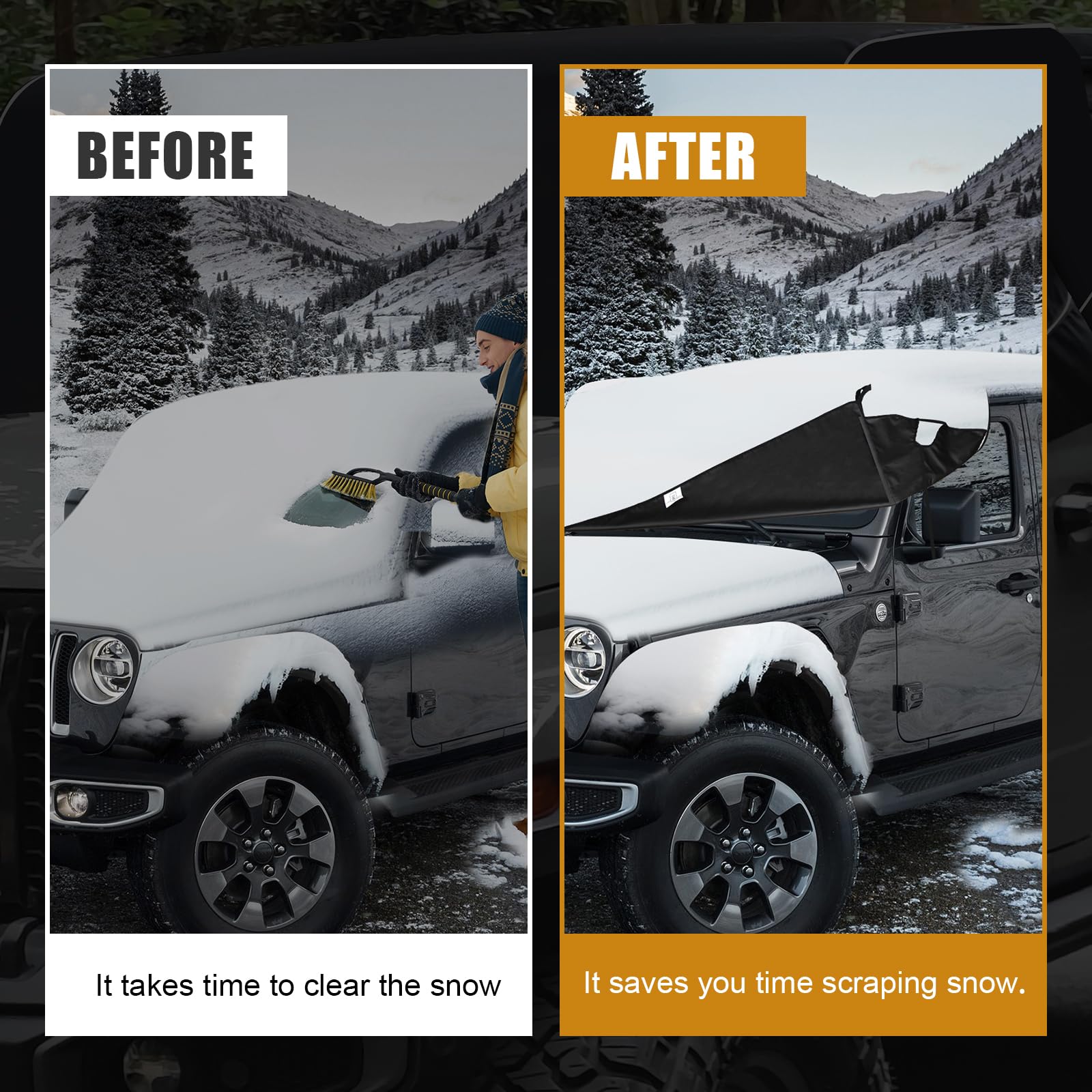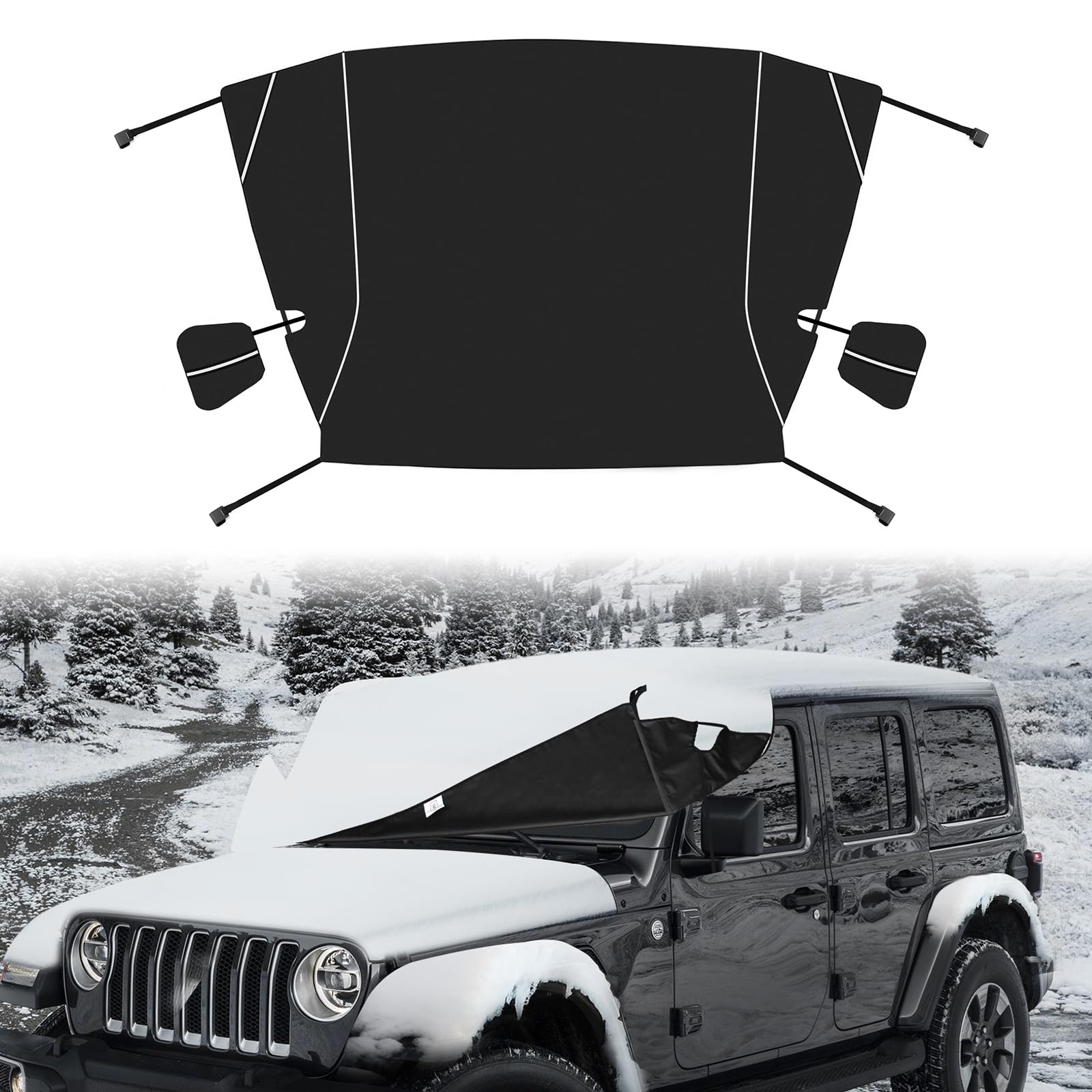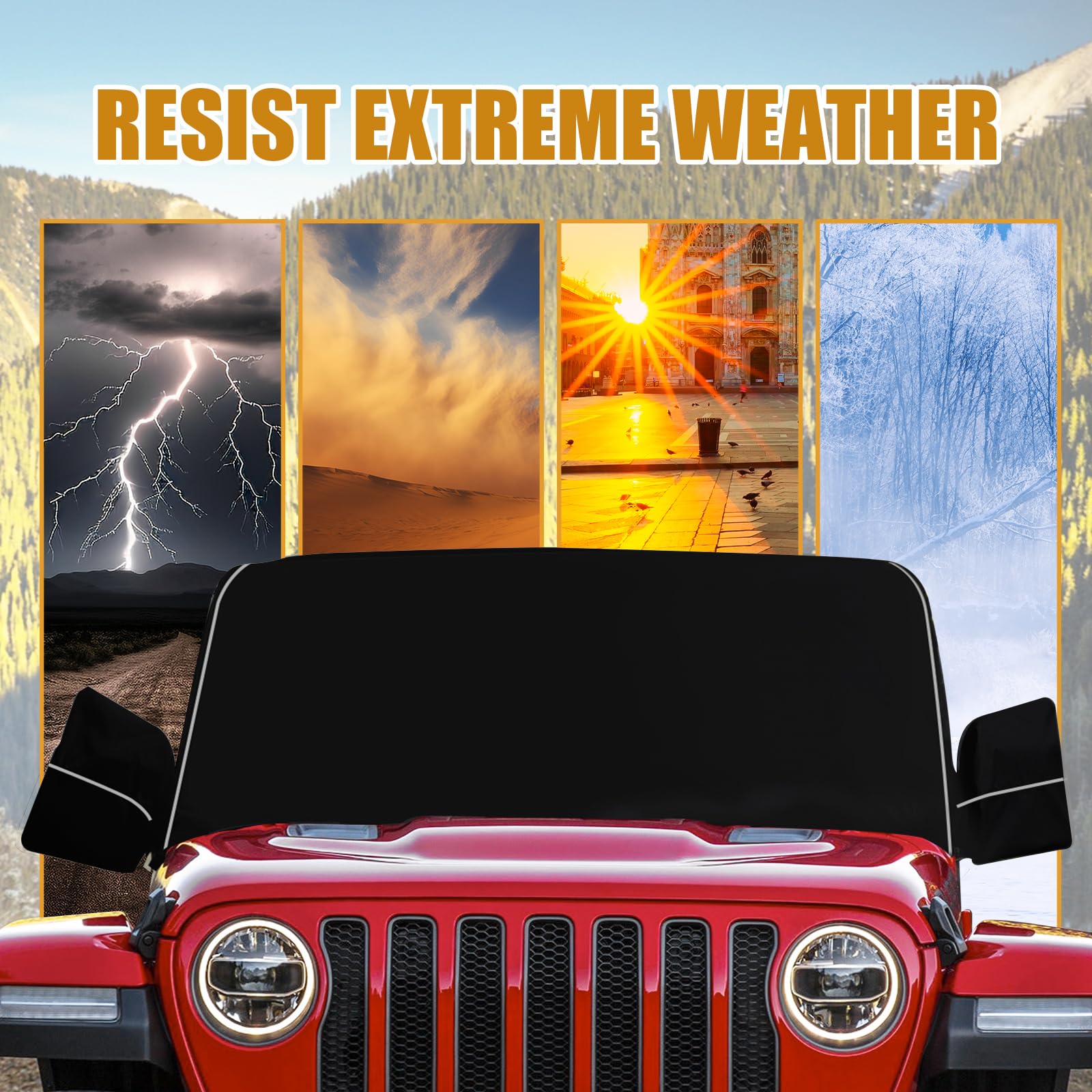 • 【All-Weather Windshield Snow Cover】 Specifically designed for 2018-2024 Jeep Wrangler JL JLU 4XE & 2020-2024 Jeep Gladiator JT, this windshield cover ensures comprehensive protection. It not only shields your windshield but also includes side mirror covers for all-around protection for your Jeep