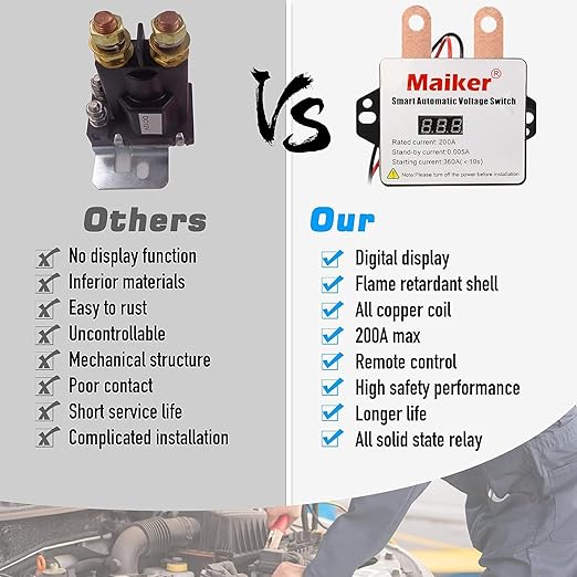 - 【Tips】Rated Current 200A Main Switch Silver Contact Surface, Universal for DC 12V Power System. Come with remote control with distance up to 160 feet. Turn on the battery before you start the engine.Note:Do not turn off the battery when your engine is working. This remote battery switch is only for battery on / off, it can't start your engine.