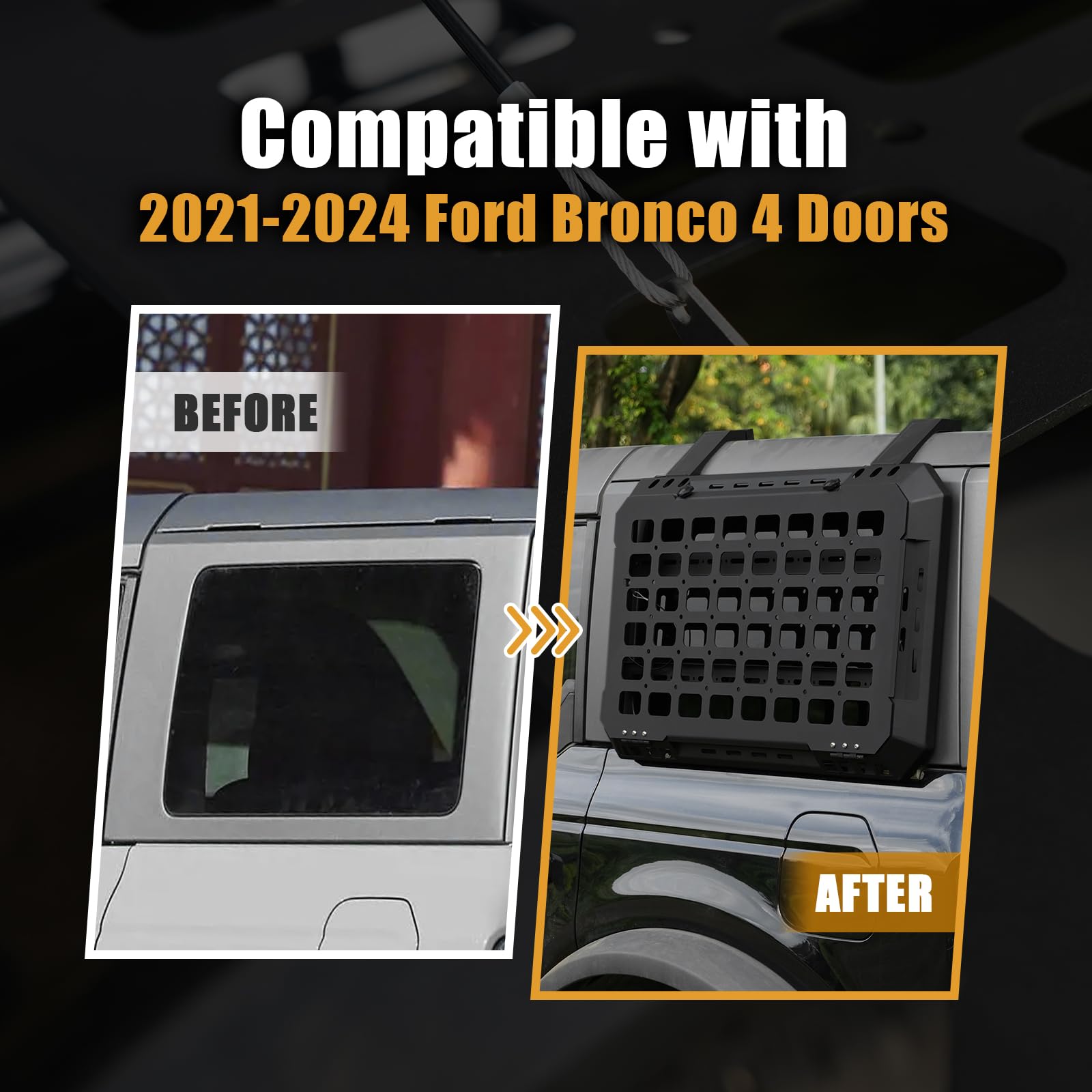 • PERFECT FIT - This rear window storage panel is Compatible with 2021-2024 Ford Bronco 4 Doors(Hard top Models), offering a seamless tactical look that integrates perfectly with your vehicle’s exterior. Provides a tailored, OEM-like fit with easy left and right-side installation options.